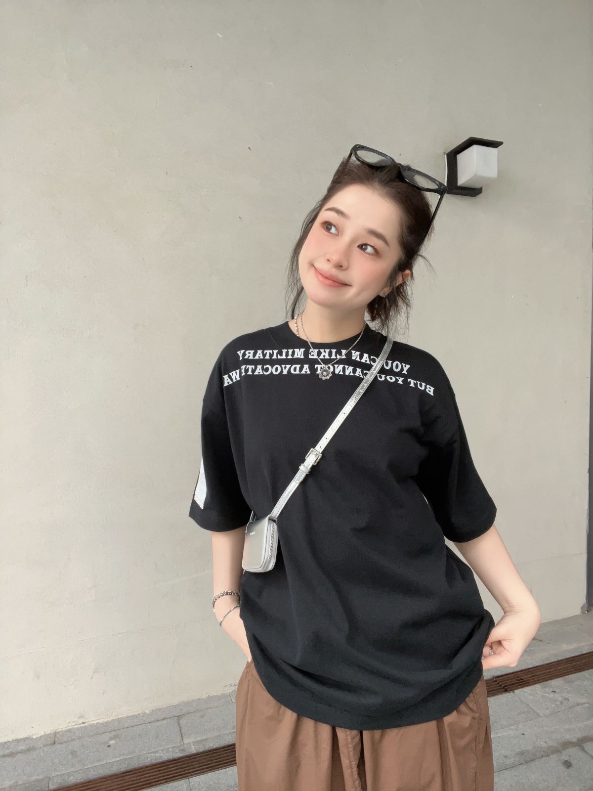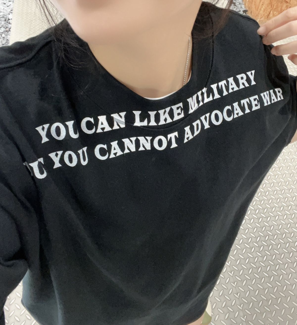 反戰標語T恤 "你可以喜歡軍事,但你不能主張倡導戰爭"。再通過特意印刷在不尋常的領口位置,增加注目度從而更容易傳達信息給人們。